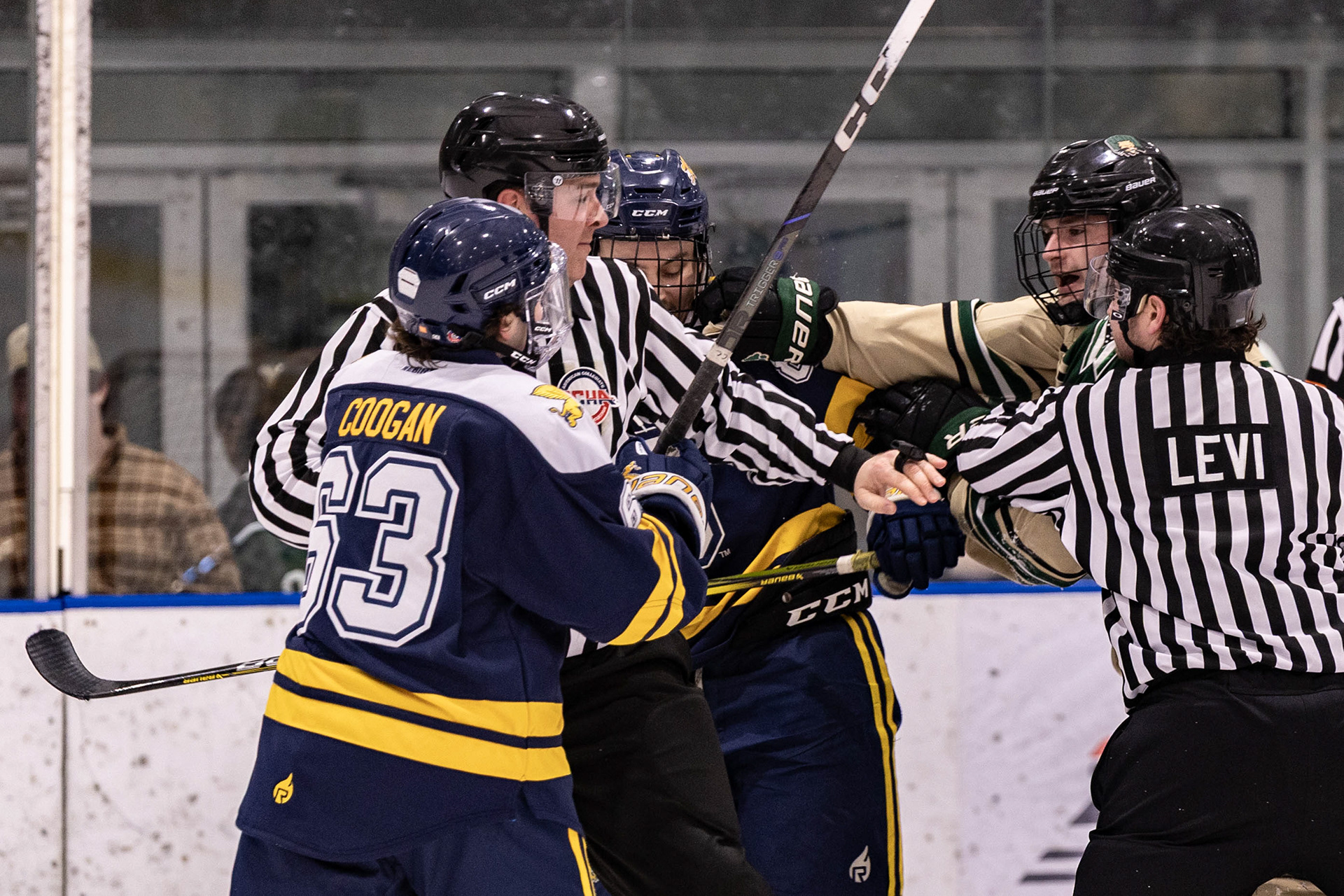 Luc Reeves (8) is held back by referees as he tries to fight a Canisius hockey player, Bird Ice Arena, Athens, Ohio, Feb. 7, 2026.